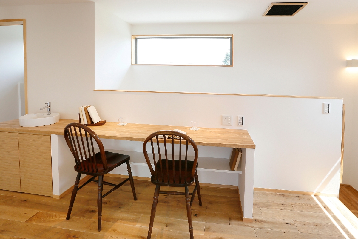 階段ホールにユーティリティスペースを確保。窓の外の緑を見ながら読書を楽しんだり色々な使い方ができます。