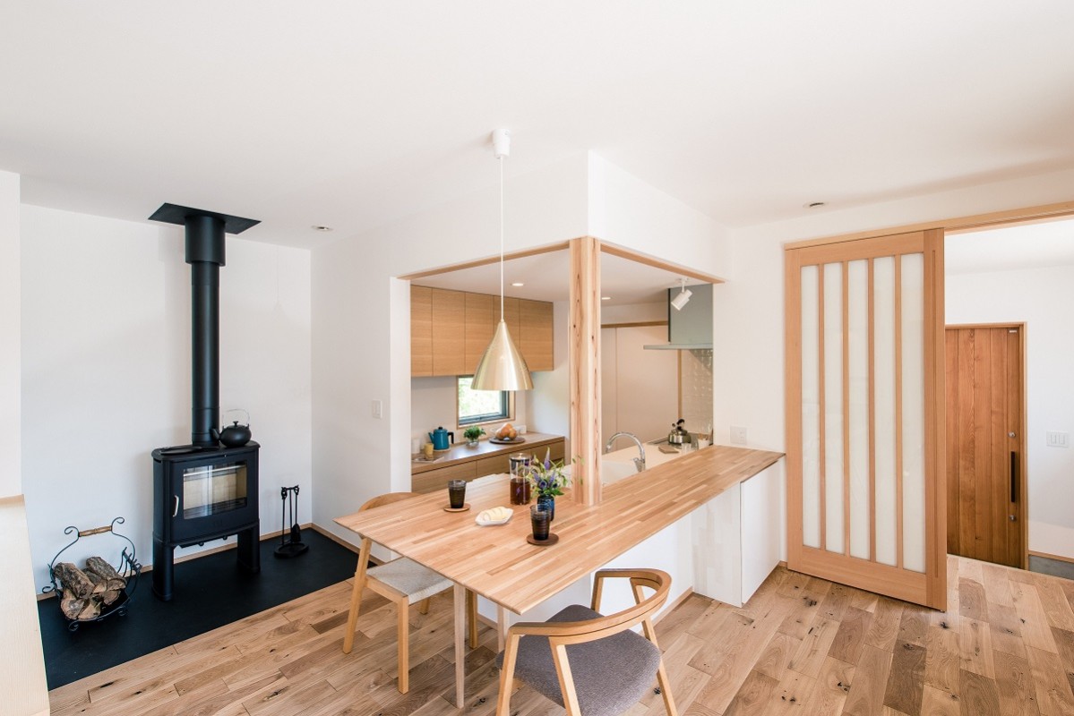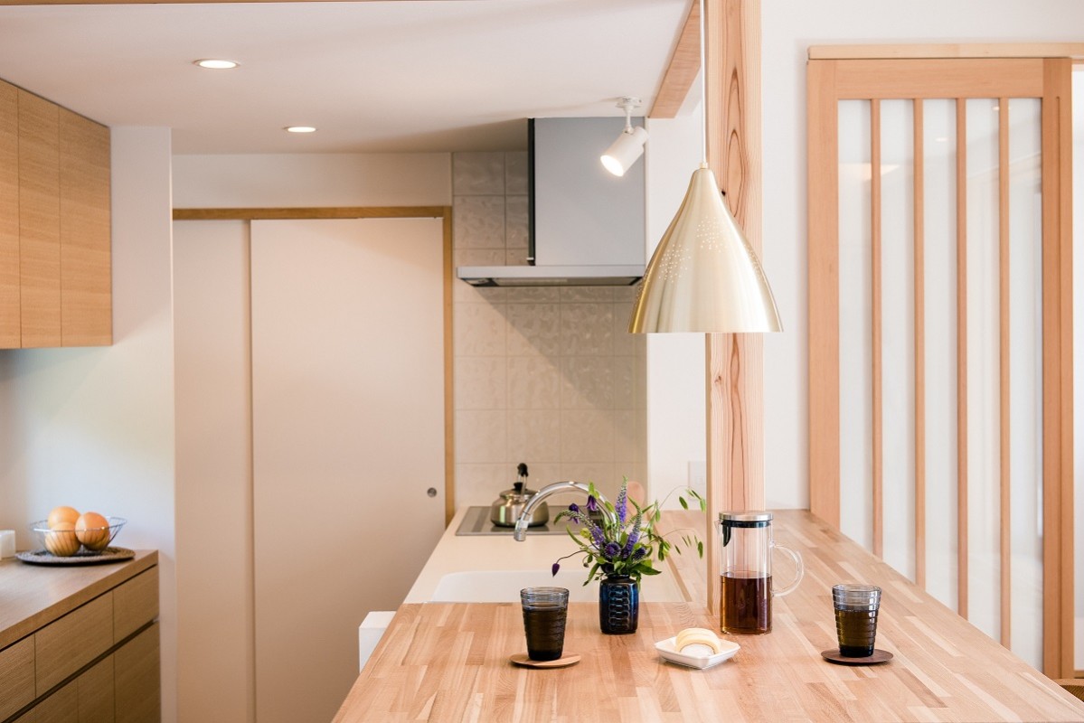 一段下がったキッチンはダイニングテーブルに座っている人と視線が合います。