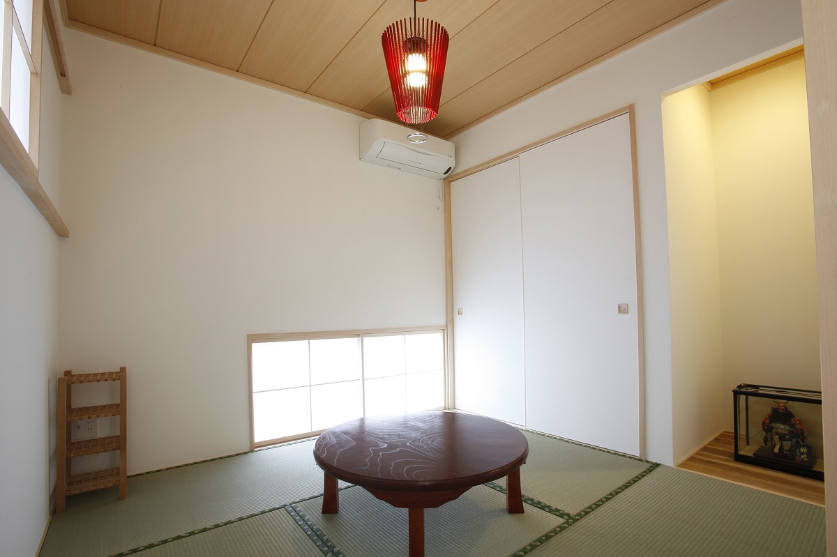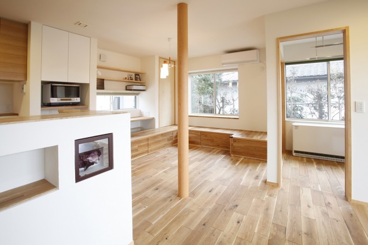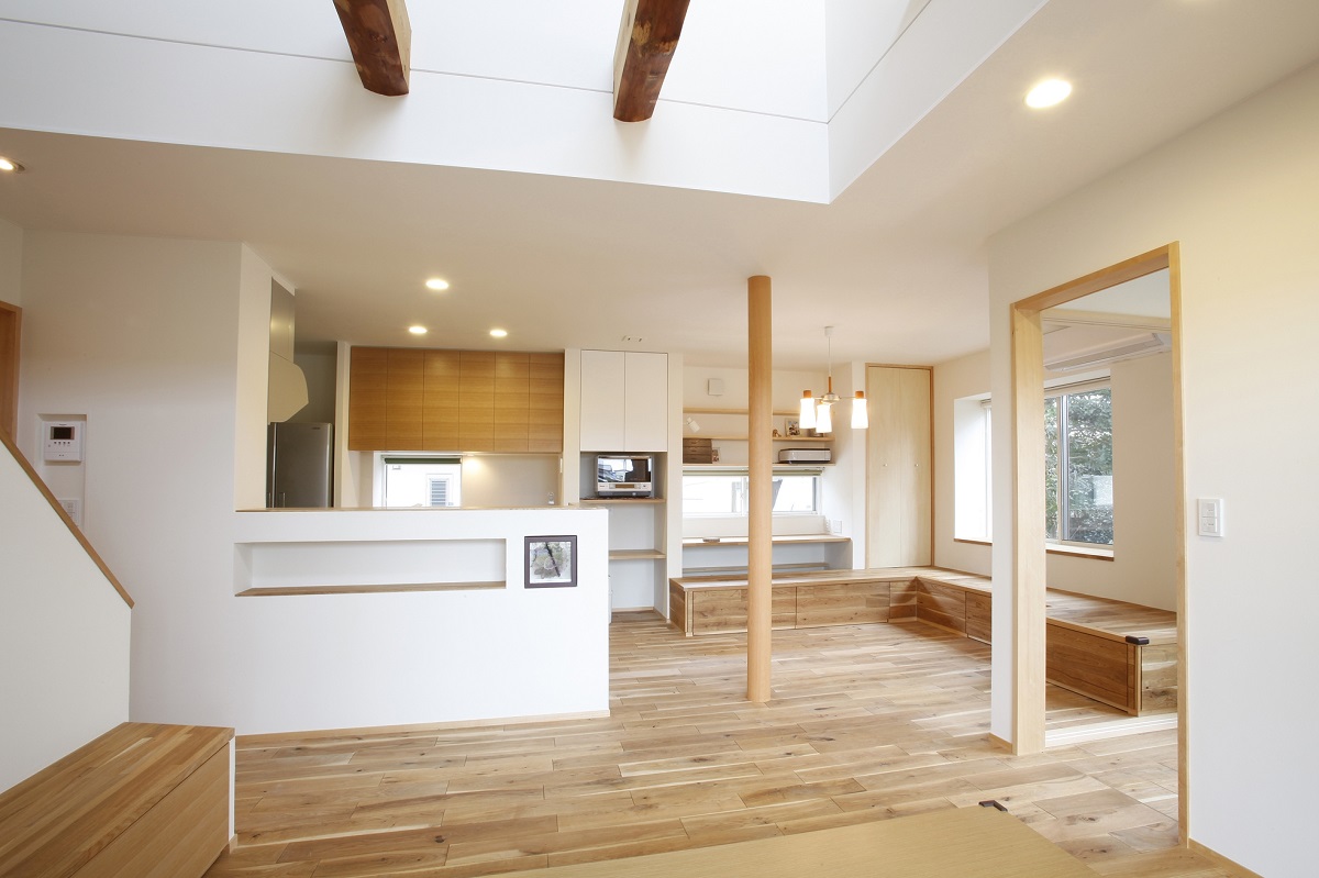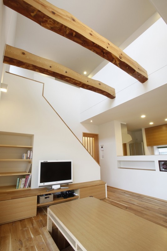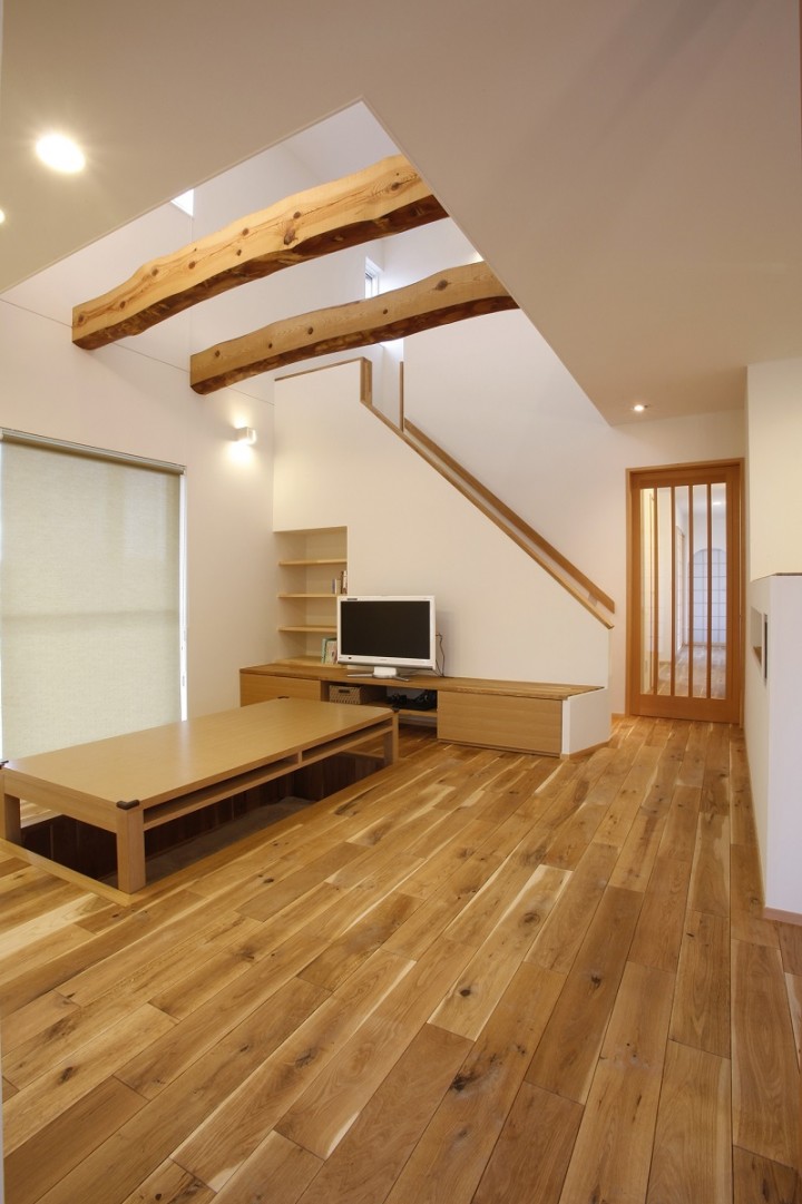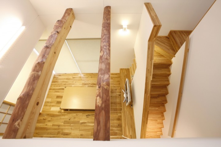 吹き抜けに設けた昔ながらの丸太梁は、ダイナミックな空間を演出するとともに、自然素材の良さを感じることができます。